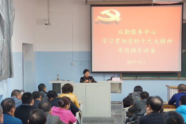 2017年11月1日下午,后勤服务中心在校本部10号教学楼第一合堂教室举办学习宣传贯彻党的十九大精神专题辅导讲座,邀请了我校马克思主义学院朱瑛教授辅导。中心领导、科级干部、全体党员、班组长及职工代表近200人聆听了讲座。